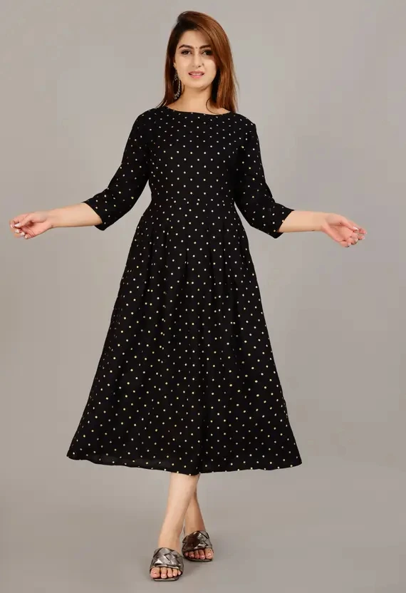 Add sophistication to your casual wardrobe with this stunning Black Printed Anarkali Gown by Aarti Fashion. Designed for women who appreciate classic elegance with a modern twist, this gown is made from soft, breathable viscose rayon fabric, ensuring all-day comfort. The gown features a round neck and stylish 3/4 sleeves, making it perfect for casual gatherings, outings, or semi-formal events. The intricate black print adds a touch of sophistication, and the stitched Anarkali style provides a flattering and graceful fit.